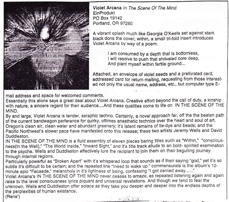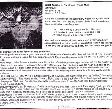 In 1994, we self-released our debut album, In the Scene of the Mind, on our EinProdukt label, which caught the attention of Talla 2XLC from Music Research/Zoth Ommog in Germany. He was impressed enough with what we were doing that he offered to release In the Scene of the Mind in all areas of the world except the United States and work with us on distributing and promoting future releases. (We retained distribution rights in the U.S.) In addition to In the Scene of the Mind, Zoth Ommog released our EP, Serenity, later that year, which featured some new Violet Arcana tracks and remixes by Zip Campisi (Thomas Franzmann) from BiGod 20. Through 1994 and ’95, Zoth Ommog also released some of our tracks that we remixed on various compilations, including Electrocity Vol.6 (Ausfahrt) where a remix of “The World Inside” sat next to tracks from Tangerine Dream, Laibach, and Love is Colder than Death.